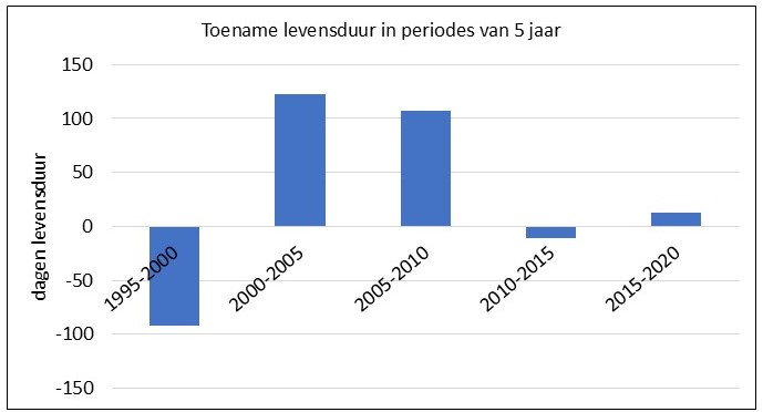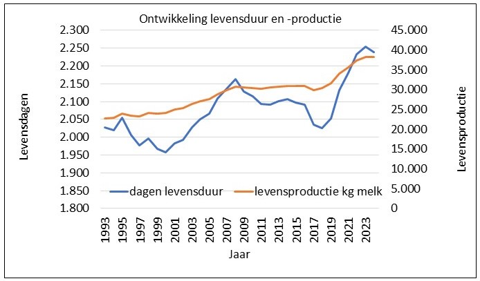 We hebben ook de ontwikkeling in levensduur geactualiseerd. Wat is er in die 12 jaar bereikt? Er is aardig wat kennis en inzicht bijgekomen en uitgewisseld. En in die 12 jaar is de afvoerleeftijd met 137 dagen verlengd en de productieve levensduur met 173 dagen (bron CRV). De productieve levensduur is in verhouding meer toegenomen dan de levensduur bij afvoer omdat de opfokperiode en de droogstand korter zijn geworden en in dezelfde levensduur zitten dus meer melkdagen. Als we de trendlijn in deze periode zouden toepassen vanaf 1995, dan zou de levensduur een stuk langer zijn geworden. Er is dus geen sprake van een constante ontwikkeling in de levensduur. Die zien we wel bij de levensproductie. De levensproductie is sinds 1995 met 63% toegenomen, en zouden we die vertalen naar de levensduur vanaf 1995, dan zou die ongeveer 700 dagen toegenomen zijn. Als je het verloop van de levensduur indeelt in blokken van 5 jaar, dan zie je dat de levensduurwinst per periode heel sterk kan verschillen: van -92 tot +123 dagen levensduur. Een verschil van meer dan 200 dagen. Kennelijk is de ontwikkeling sterk afhankelijk van iets anders. Aan de stierkeuze kan het niet liggen en ook niet aan de omstandigheden waaronder de koeien worden gehouden want die veranderen niet zo snel. Bovendien zijn die de afgelopen decennia op veel bedrijven flink verbeterd. Maar waar ligt het dan wel aan?